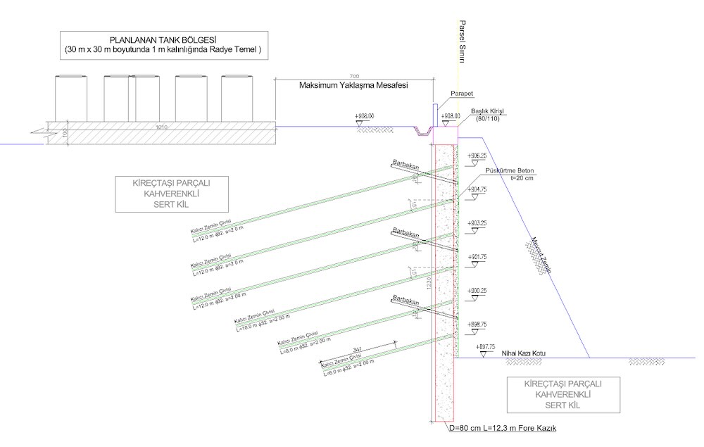 Kalıcı durumda deprem analizleri hesaba katılarak tasarlanan proje kapsamında; derin kazı güvenliğini ve çevre yapıların stabilitesini sağlamak amacıyla Ø80 cm çapında toplam 262 adet 3932 m fore kazık imalatı ve 8344 m kalıcı zemin çivisi uygulamaları gerçekleştirilmiştir. Kazı derinliği ve çevre yüklerine göre projelendirilen bu sistem, imalat sürecinde uygulanan kazık süreklilik (PIT) ve zemin çivisi çekme deneyleri ile denetlenmiş; yapılan analizler sonucunda sistemin gerekli mukavemet, rijitlik ve güvenlik şartlarını karşıladığı teknik olarak irdelenmiştir.