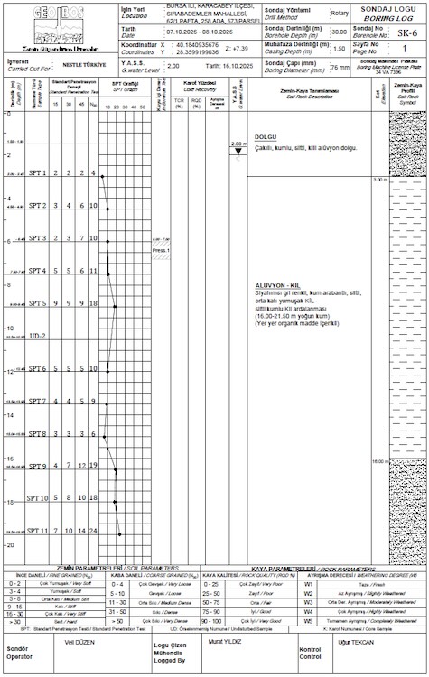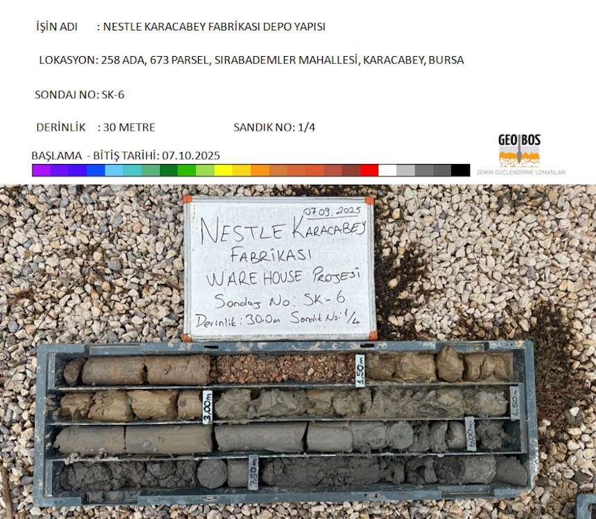 Bursa Karacabey'de inşa edilmesi planlanan Nestle Depo Yapısı sahasında, zemin koşullarını tespit etmek amacıyla Ekim 2025 tarihinde zemin etüt çalışmaları gerçekleştirilmiştir. Tarafımızca yürütülen bu süreçte, sahada her biri 30,00 m derinliğinde toplam 6 adet sondaj yapılmış, jeofizik deney ölçümleri ile zemin profili analiz edilmiştir. Tarafımızca hazırlanan Zemin ve Temel Etüt Raporların'da oturma riski ve potansiyel sıvılaşma durumu incelenmiştir.